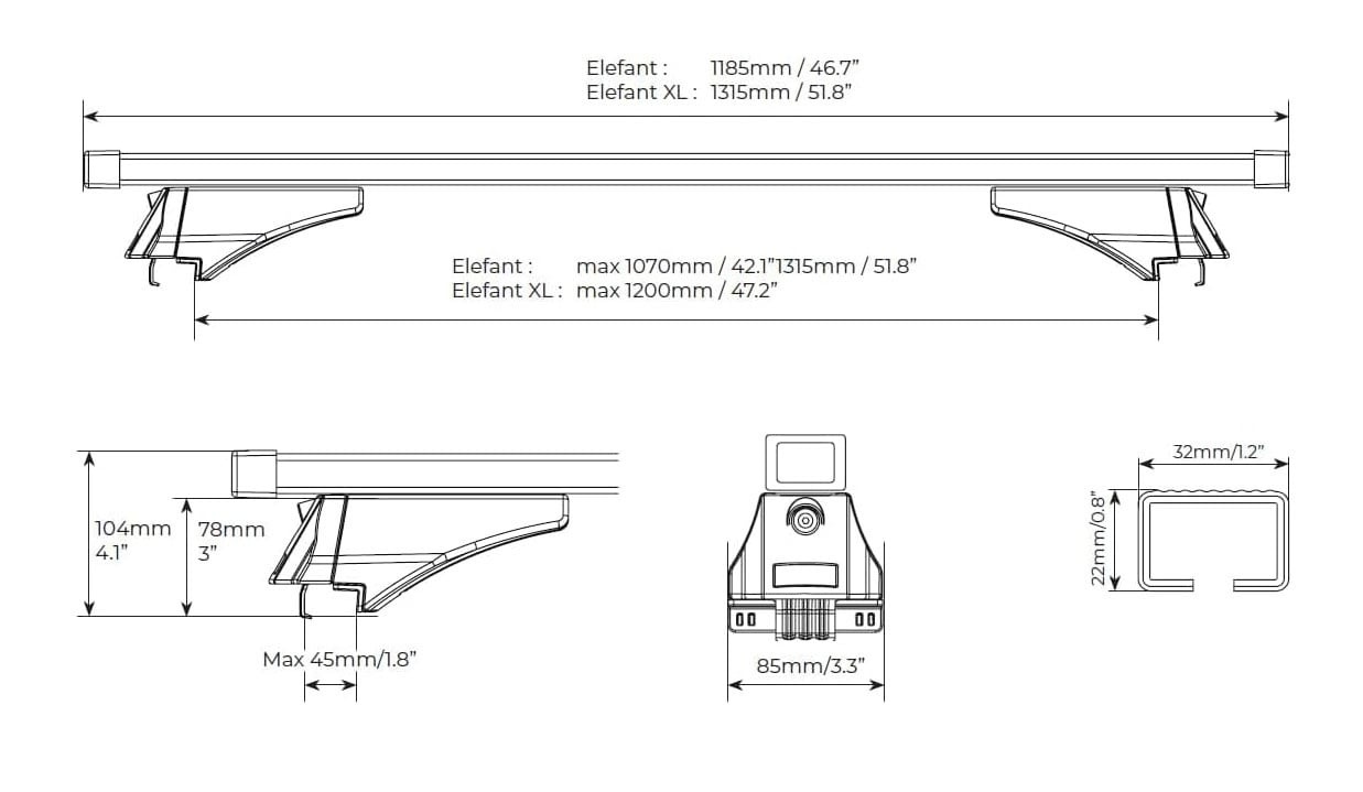 Barele au sectiune patrata si se potrivesc pentru toate tipurile de portbagaje ce au prindere de tip „U” (cutii portbagaj, suport bicicleta, suport schi, portbagaj caiac/canoe, etc.).