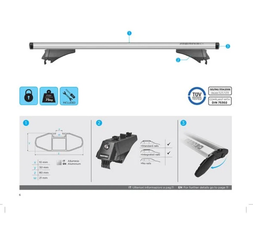 Setul de bare transversale cuprinde toate elementele necesare pentru montarea pe barele longitudinale de tip sina (integrate) ale autoturismului.