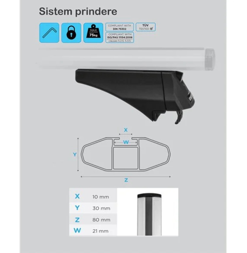 Barele au sectiune aerodinamica de 8 cmsi se potrivesc pentru toate tipurile de portbagaje (cutii portbagaj, suport bicicleta, suport schi, portbagaj caiac/canoe, etc.). Profilul aerodinamic in forma de aripa al barelor transversale ajuta la minimalizarea zgomotului si reduce rezistenta aerodinamica.