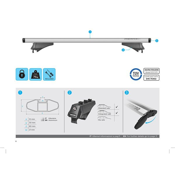 Bare transversale din aluminiu Menabo Leopard Silver va ofera o flexibilitate sporita in transportarea bagajelor datorita capacitatii de incarcare de 75 kg, dar si a canalului standard pentru prindere cu profil T a diferitelor accesorii.