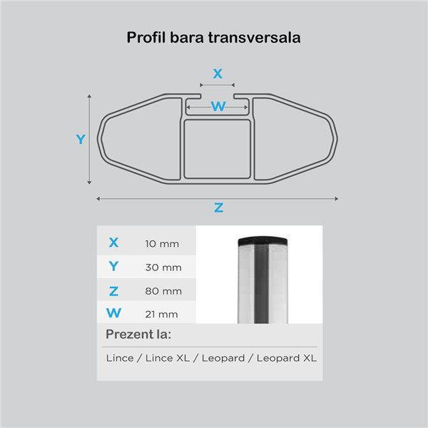 Barele au sectiune aerodinamica de 8 cm si se potrivesc pentru toate tipurile de portbagaje (cutii portbagaj, suport bicicleta, suport schi, portbagaj caiac/canoe, etc.). Profilul aerodinamic in forma de aripa al barelor transversale ajuta la minimalizarea zgomotului si reduce rezistenta aerodinamica.