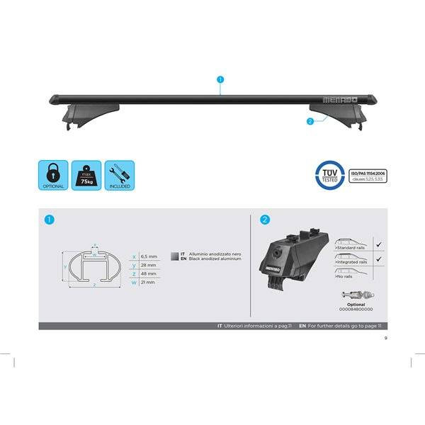 Bare transversale din aluminiu Menabo Tiger Black va ofera o flexibilitate sporita in transportarea bagajelor datorita capacitatii de incarcare de 75 kg, dar si a canalului standard pentru prindere cu profil T a diferitelor accesorii.