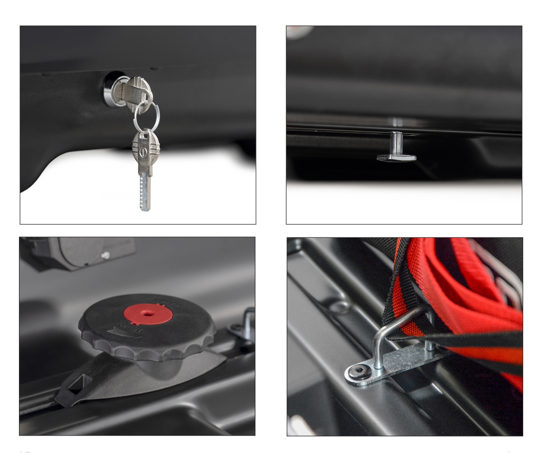 Lungimea exterioara a cutiei este de 163 cm in timp ce latimea acesteia ajunge la 90,7 cm, iar inaltimea este de 36 cm. Montajul cutiei Diamond DUO se face rapid si usor cu ajutorul sistemului Quick Fix ce securizeaza prinderile T de canalul barelor transversale. Astfel, prin strangerea celor patru rotite din interiorul cutiei nu vei mai avea nevoie de chei speciale pentru a putea face montajul.