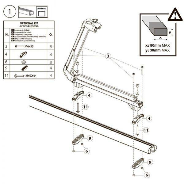 Kitul optional de prindere permite fixarea suportului de schi/snowboard Menabo Iceberg prin exteriorul barilor transversale (prin prindere U).